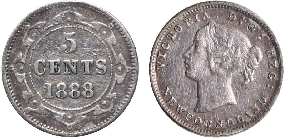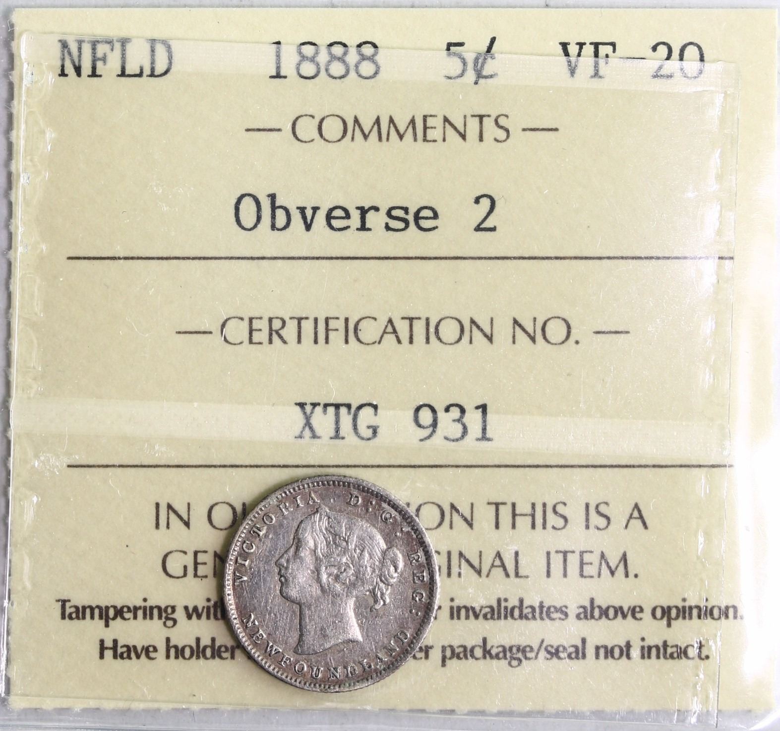 Nfld; 1888 5¢ "Obv.2" ICCS Very Fine-20. A pleasing example.