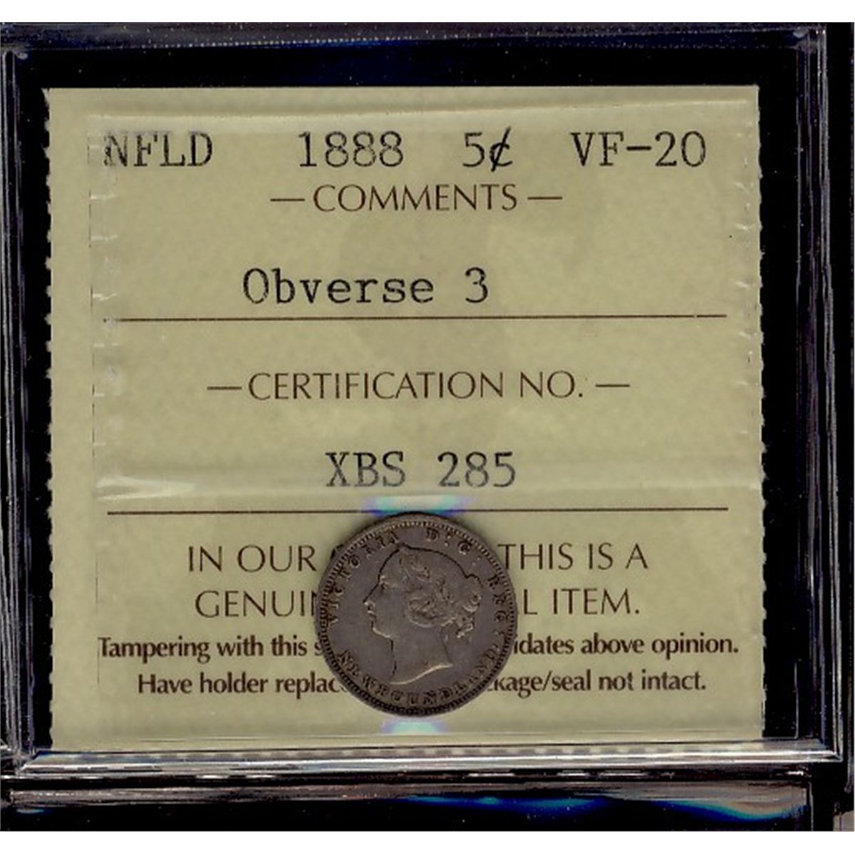 Nfld 1888 5¢ Obv 3 ICCS VF20.