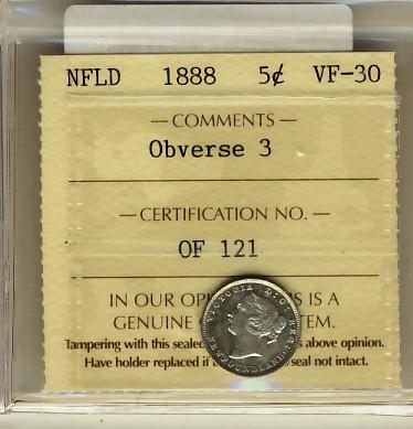 Nfld 1888 5¢ Obv 3 ICCS VF30.