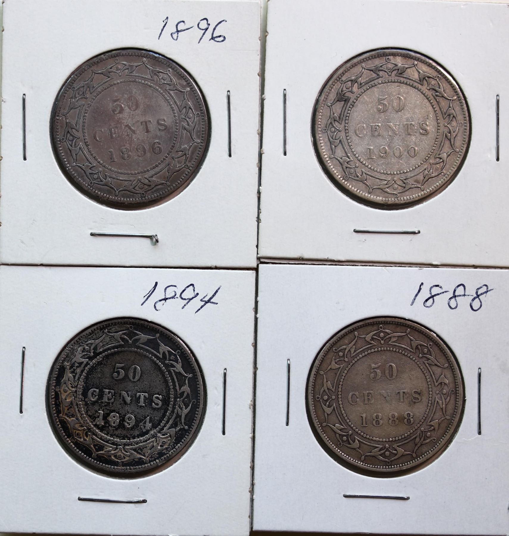Nfld; 1888 50¢, 1894, 1896, 1900, Lot of 4 coins Fine to Fine+.