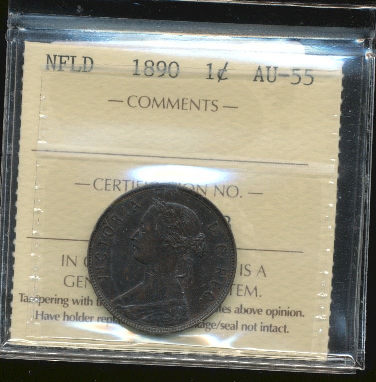 Nfld 1890 1¢ ICCS AU55. Cut on neck.
