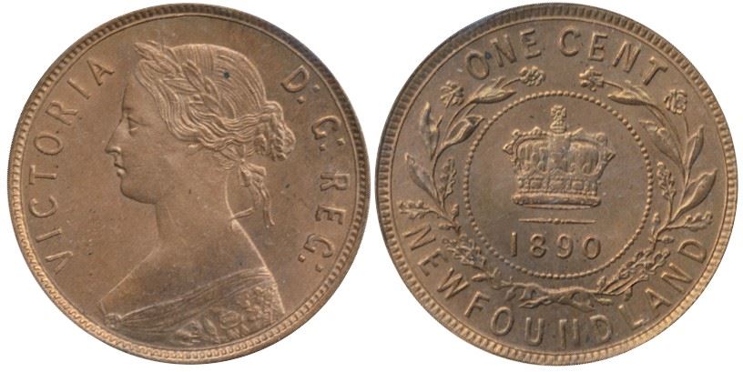 Nfld 1890 1¢ ICCS MS63 RED. 75%/80% Red. Pretty orange & gold Rev. An above average strike for this date. Old Seal ICCS holder.