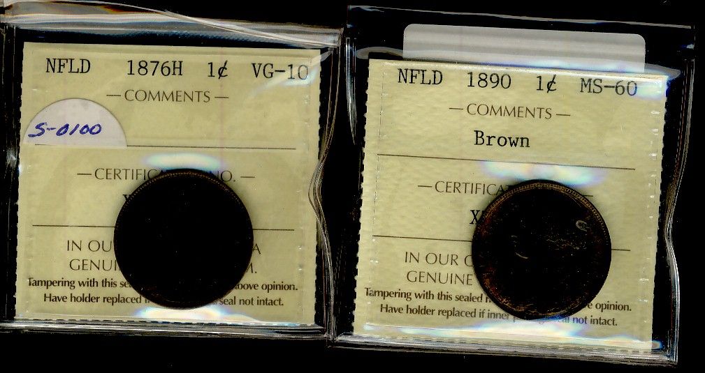 Nfld 1890 1¢ MS60 & 1876H VG10. Lot of 2 ICCS graded coins.