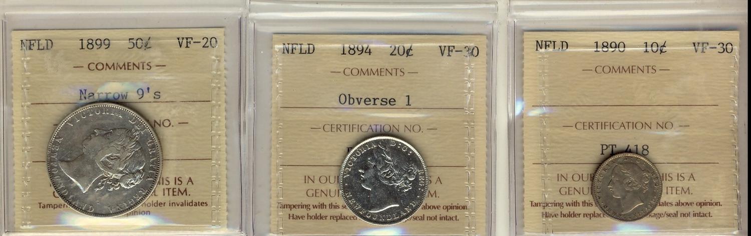 Nfld 1890 10¢ VF30, 1894 Obv 1 20¢ VF30 & 1899 50¢ Nar VF20. Lot of 3 ICCS coins.