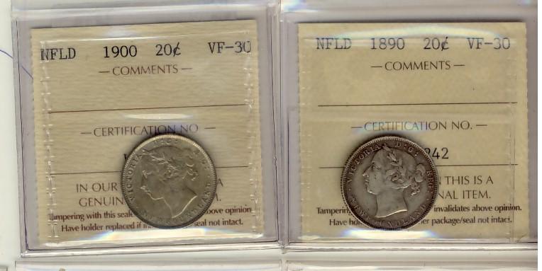 Nfld 1890 & 1900 20¢ ICCS VF30. Lot of 2 coins.
