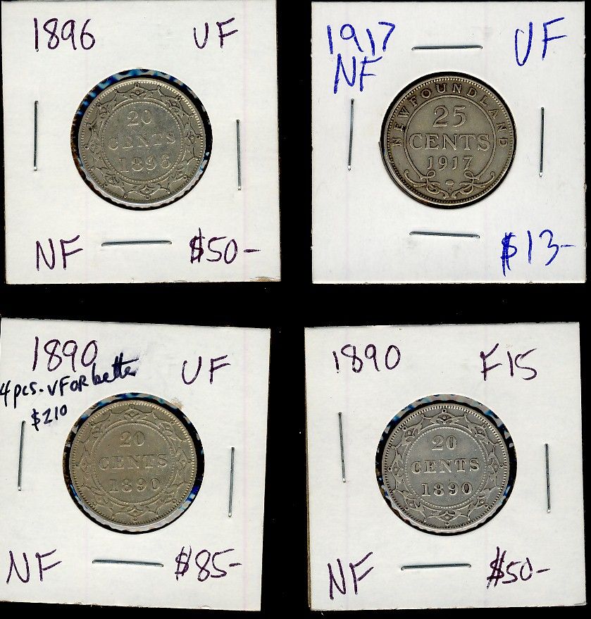 Nfld 1890(2) 20¢, 1896 & 1917c. Lot of 4 pcs VF or better.