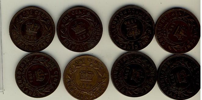 Nfld 1890(3) 1¢, 1894(3), 1896 & 1904. Lot of 8 coins all VF+ to EF. Should be viewed.