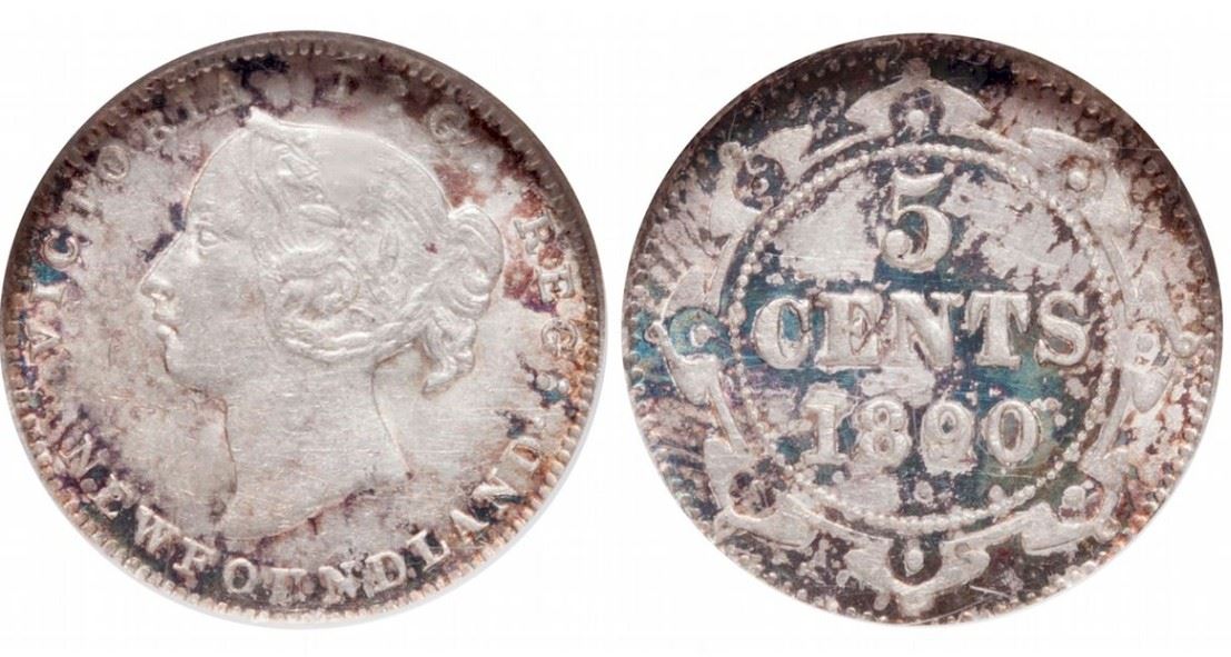 Nfld 1890 5¢ NGC MS63. Hints of blue toning in the devices, over satin fields. A rare mint state example.