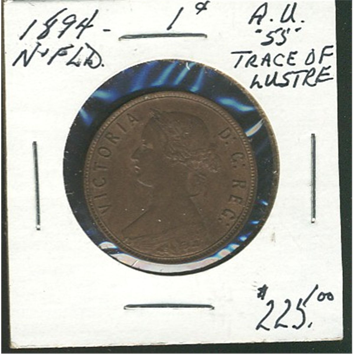 Nfld 1894 1¢ AU55 with Trace lustre. (PBA).