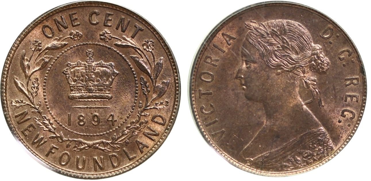Nfld; 1894 1¢ PCGS Very Choice Mint State-64 RB - 65% RED lustre. Highly lustrous and attractive issue. Very scarce to find in this near Gem condition.
