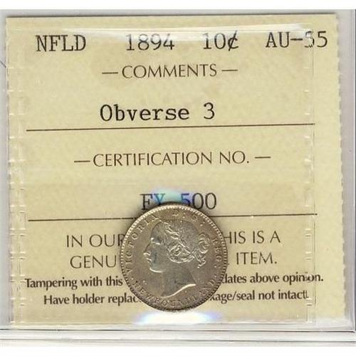 Nfld 1894 10¢ Obv 3 ICCS AU55.
