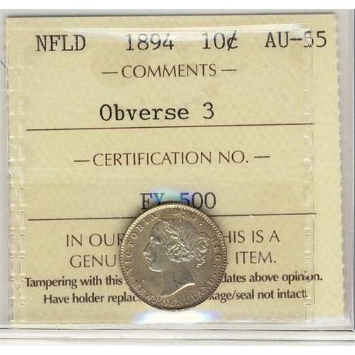 Nfld 1894 10¢ Obv 3 ICCS AU55.