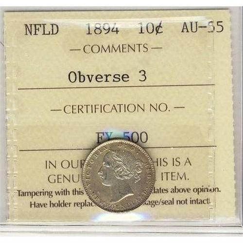 Nfld 1894 10¢ Obv 3 ICCS AU55.