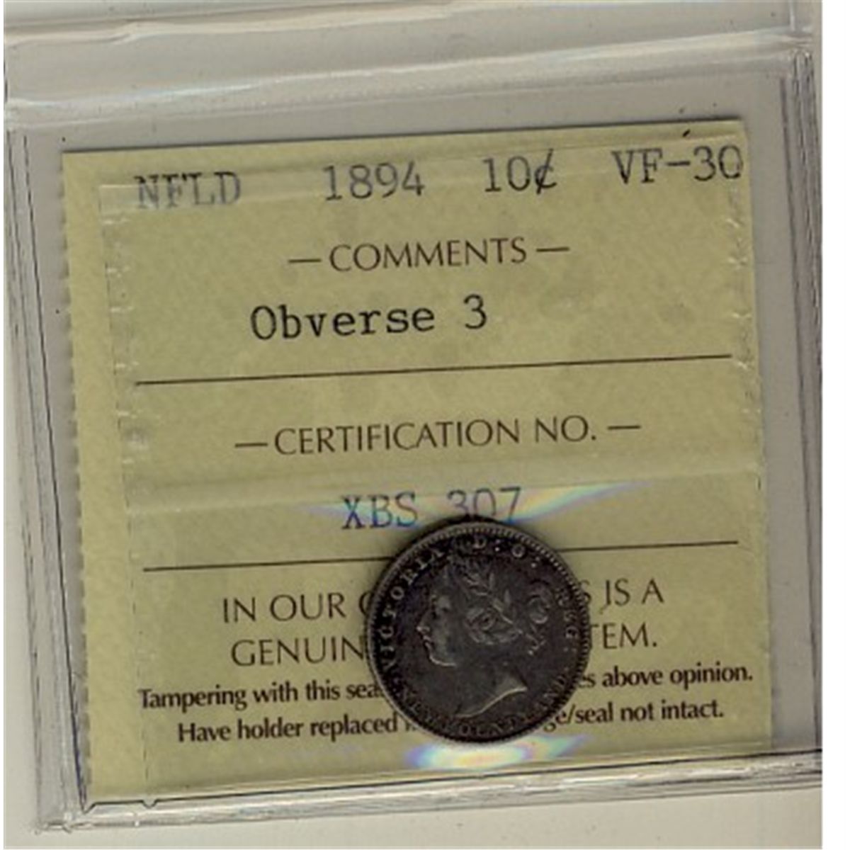 Nfld 1894 10¢ Obv 3 ICCS VF30.