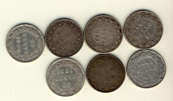 Nfld 1894(2), 1899 Hook, 1899 Lg(2) & 1900(2) 20¢. Lot of 7 coins all VF or better.
