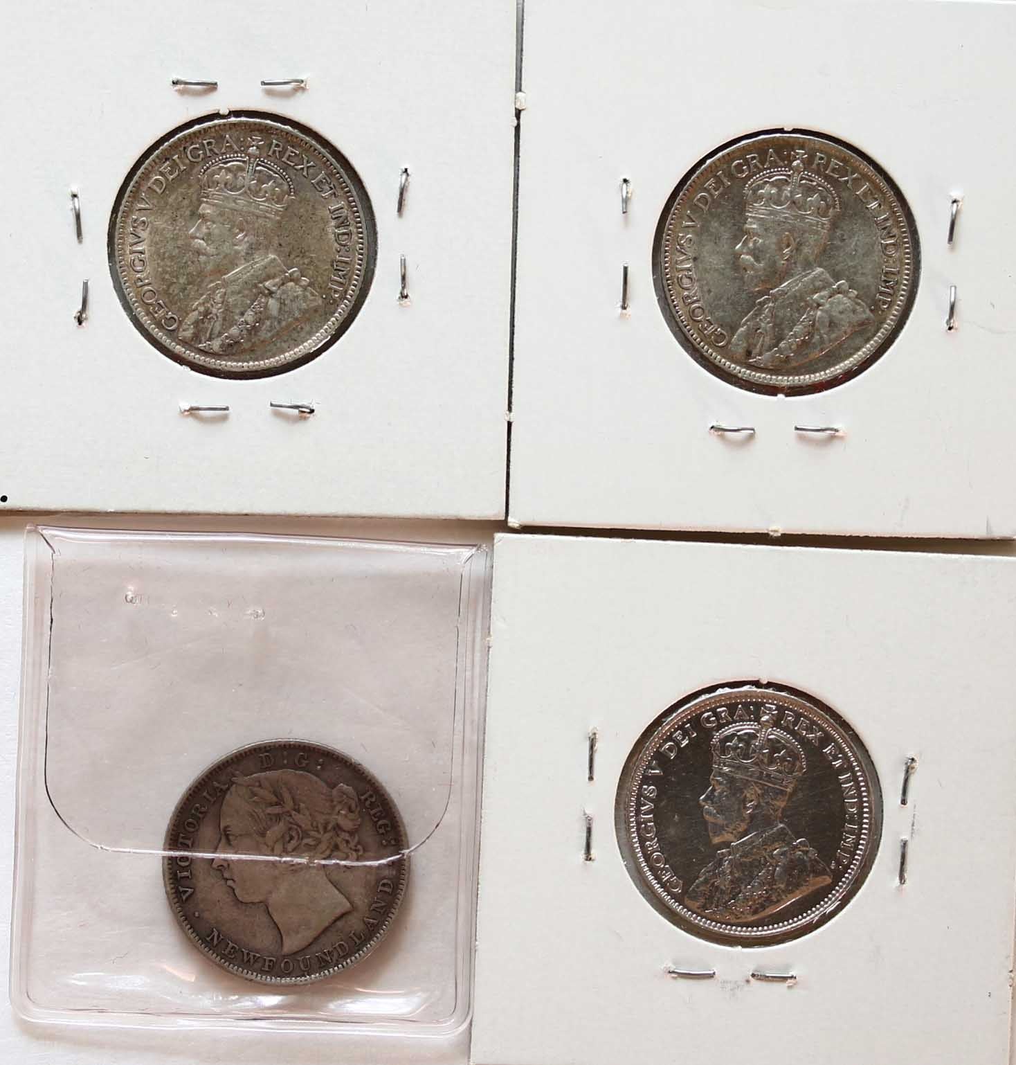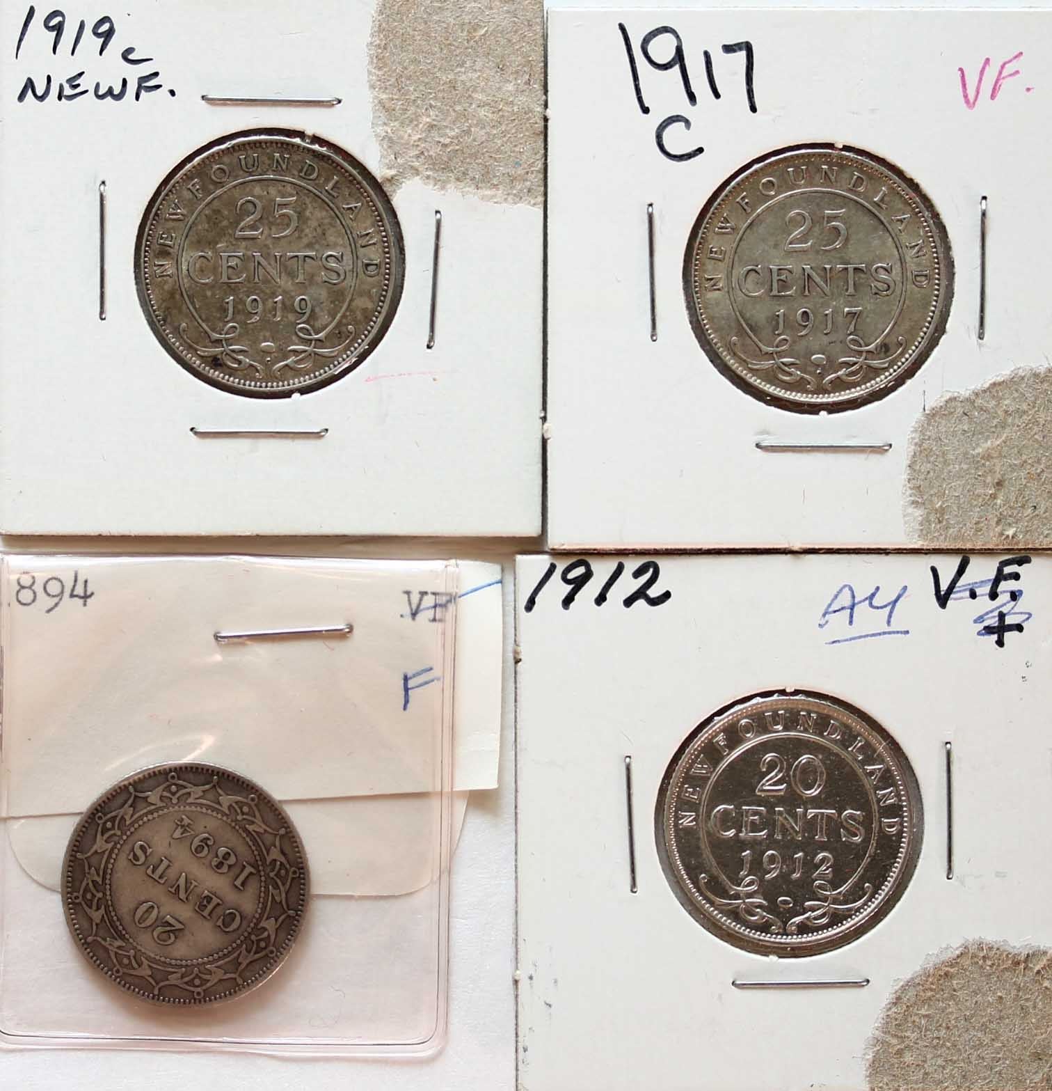 Nfld; 1894 20¢, 1912, 1917c 25¢, 1919c, VF to EF, Lot of 4 coins.