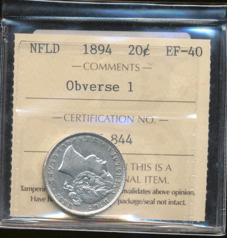 Nfld 1894 20¢ Obv. 1 - ICCS EF40. Many would grade it 45.