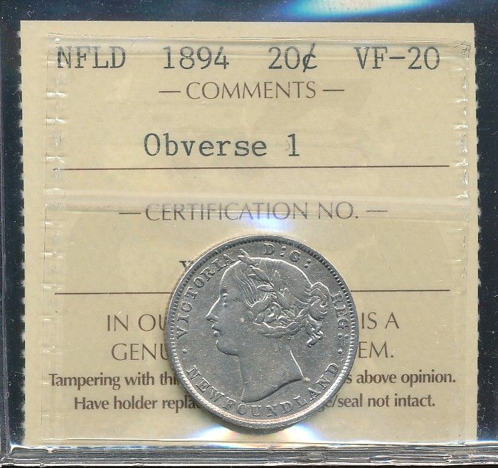 Nfld 1894 20¢ Obv 1 ICCS VF20.