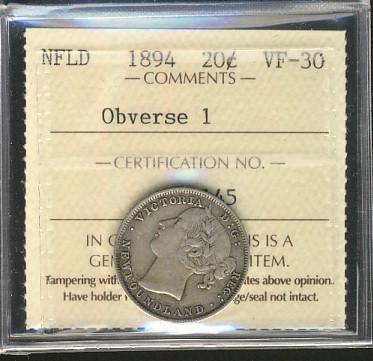 Nfld 1894 20¢ Obv 1 ICCS VF30.