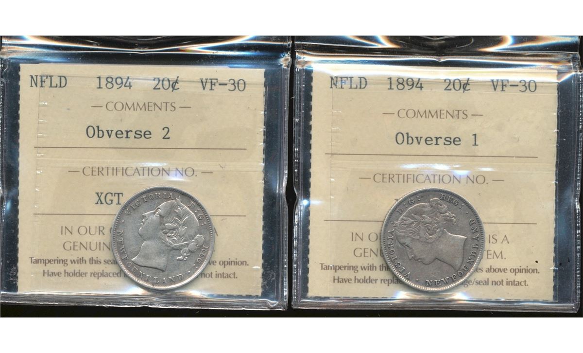 Nfld 1894 20¢ Obv 1 & Obv 2 ICCS VF30. Lightly toned. Lot of 2 coins.