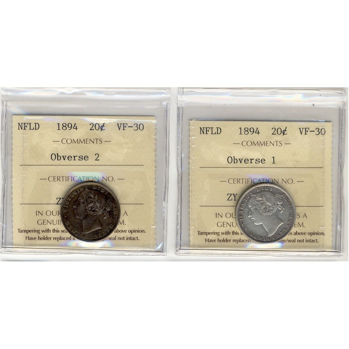 Nfld 1894 20¢ Obv 1 & Obv 2 ICCS VF30. Lot of 2 coins.