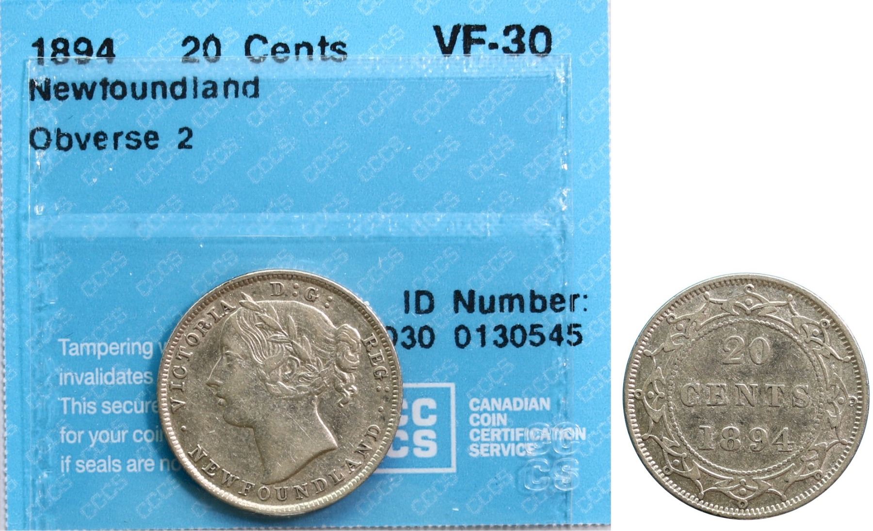 Nfld; 1894 20¢ "Obv. 2" CCCS Choice Very Fine-30 Lustrous.