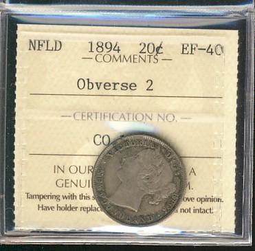 Nfld 1894 20¢ Obv 2 ICCS EF40.