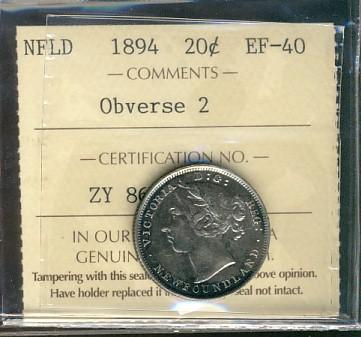 Nfld 1894 20¢ Obv 2 ICCS EF40.