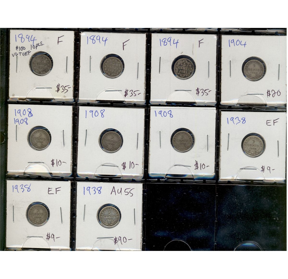 Nfld 1894(3) 5¢, 1904, 1908(3) & 1938(3). Lot of 10 pcs VG to EF.