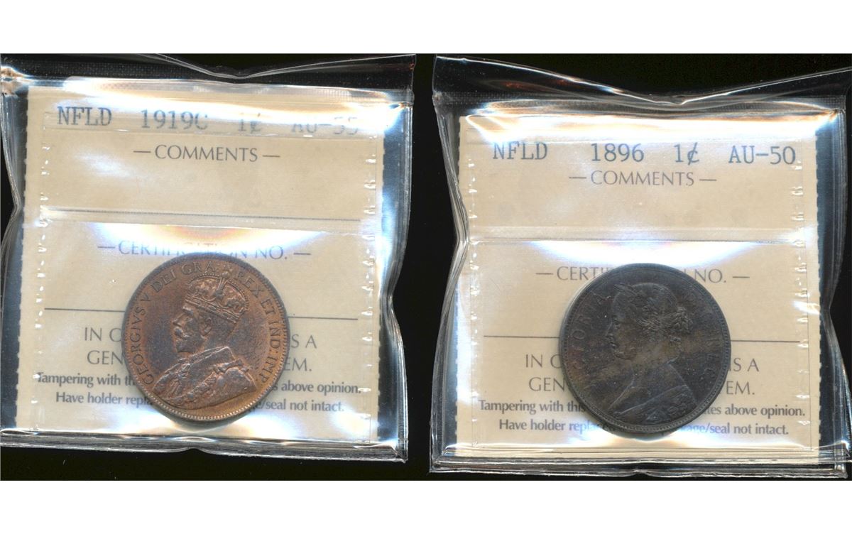 Nfld 1896 1¢ AU50 & 1919 AU55. Lot of 2 ICCS graded coins.
