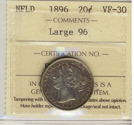 Nfld 1896 20¢ Large 96 ICCS VF30.