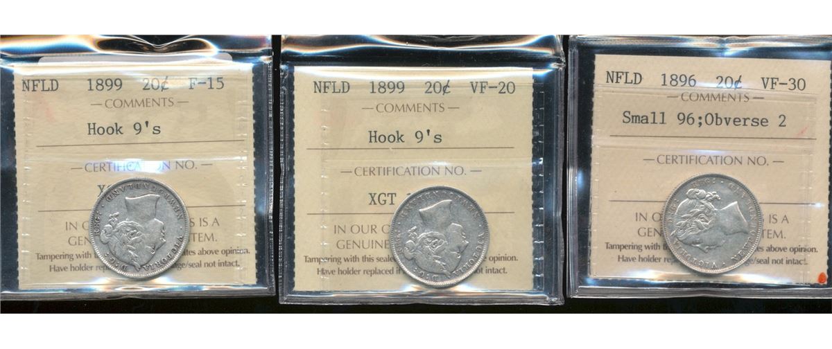 Nfld 1896 20¢ SD VF30, 1899 Hooked VF20, 1899 Hooked Fine 15. Lot of 3 ICCS graded coins.