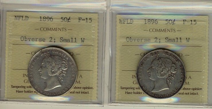 Nfld 1896 50¢ Obv 2 Sml W ICCS F15. Lot of 2 coins.