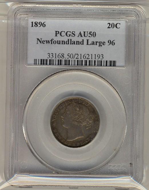 Nfld 1896 "Large 96" 20¢ PCGS AU50, nicely toned. Rare vari