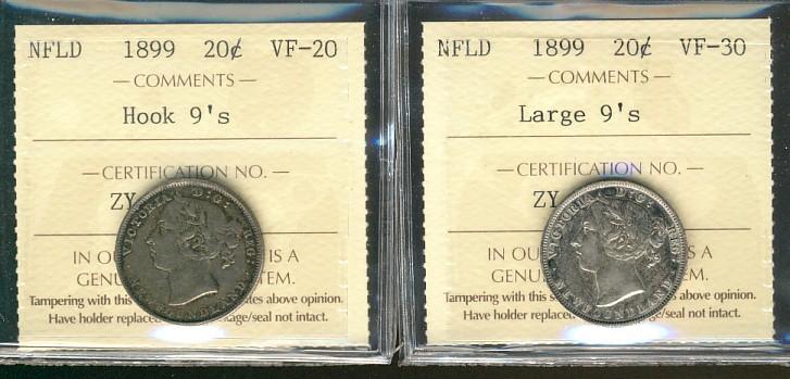 Nfld 1899 20¢ Hook 9's VF 20 & Lg 9's ICCS VF30. Lot of 2 coins.