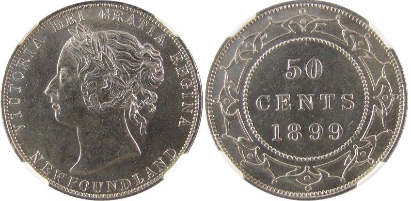 Nfld 1899 50¢ NGC MS62. Crossed ICCS MS60, Wide 9's. Wow example. Fully brilliant and lustrous. Well struck with nice surfaces and clean fields.The best of the best. One of the nicest example ever graded by ICCS and handled by the cataloguer. Worth a premium bid.