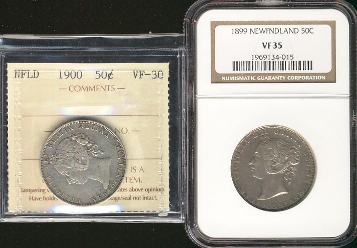 Nfld 1899 50¢ NGC VF35 & 1900 ICCS VF30. Lot of 2 coins.
