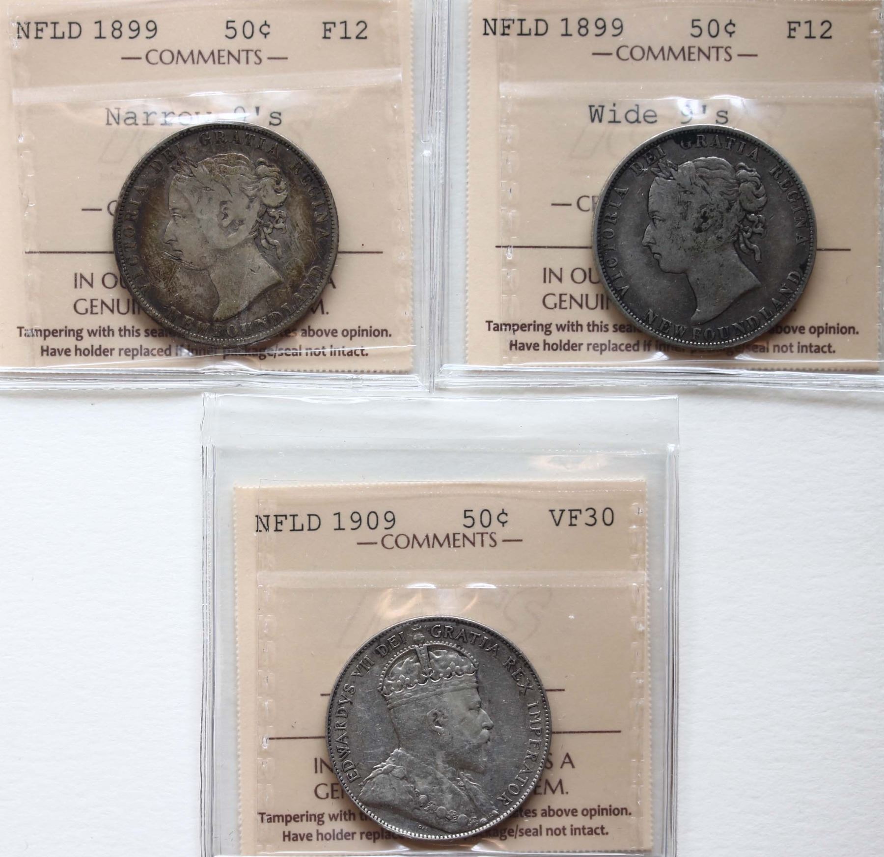 Nfld; 1899 50¢ Narrow 9's ICCS Fine-12, 1899 50¢ Wide 9's ICCS Fine-12, 1909 50¢ ICCS Choice Very Fine-30. Lot of 3 coins.