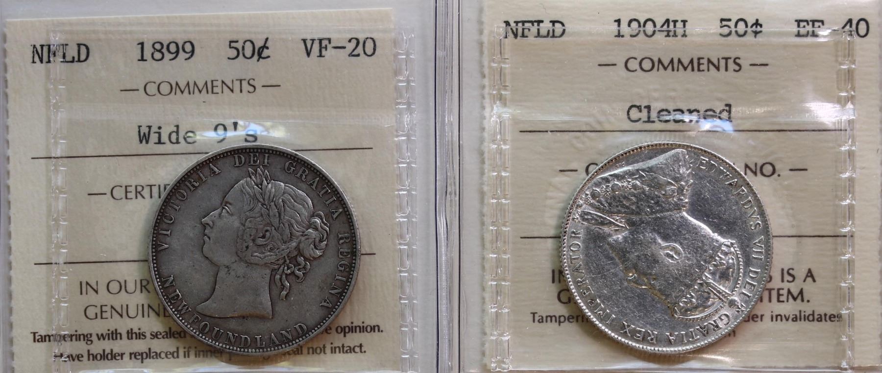 Nfld; 1899 50¢ "W 9's", 1904H Cleaned. Both coins ICCS Very Fine-20 & Extra Fine-40