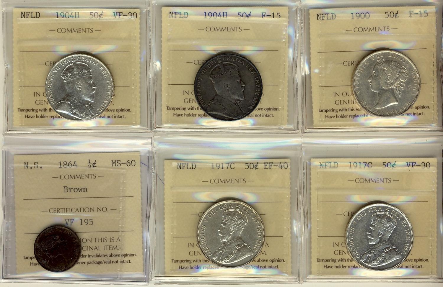 Nfld 1900, 1904H F15, 1904H, 1917c VF30 & 1917c EF40 50¢. Also includes N.S. 1864 1/2¢ ICCS MS60BN. Lot of 6 ICCS graded coins.
