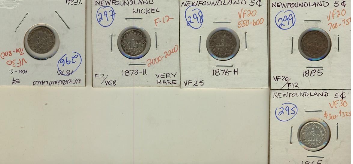 Nfld 1903, 1908, 1912, 1917c (2), 1929, 1938, 1941c (2), 1942c, 1945c, 1947c (2) 5¢, VF20 to Ef40, 1