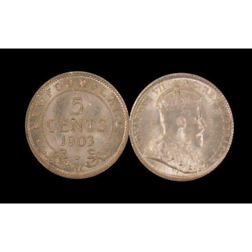 Nfld 1903 5¢ ICCS MS64, superb example. Fully brilliant and lustrous. In top 5 cencus.