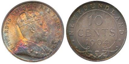 Nfld 1904H 10¢ PCGS MS67. Superb Gem eye appeal with strong underlying lustre. Top 3 graded.