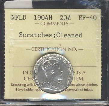 Nfld 1904H 20¢ ICCS SCRATCHES CLEANED EXTRA FINE-40.