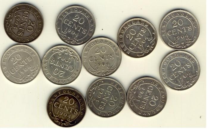 Nfld 1904H 20¢. Lot of 11 coins Good to Fine to VF. Should be viewed.