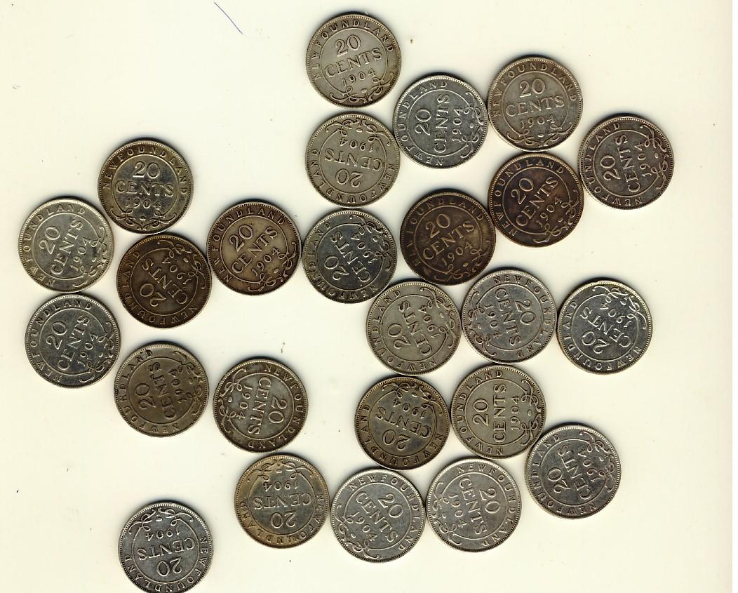 Nfld 1904H 20¢. Lot of 25 coins Good to VG. Should be viewed.