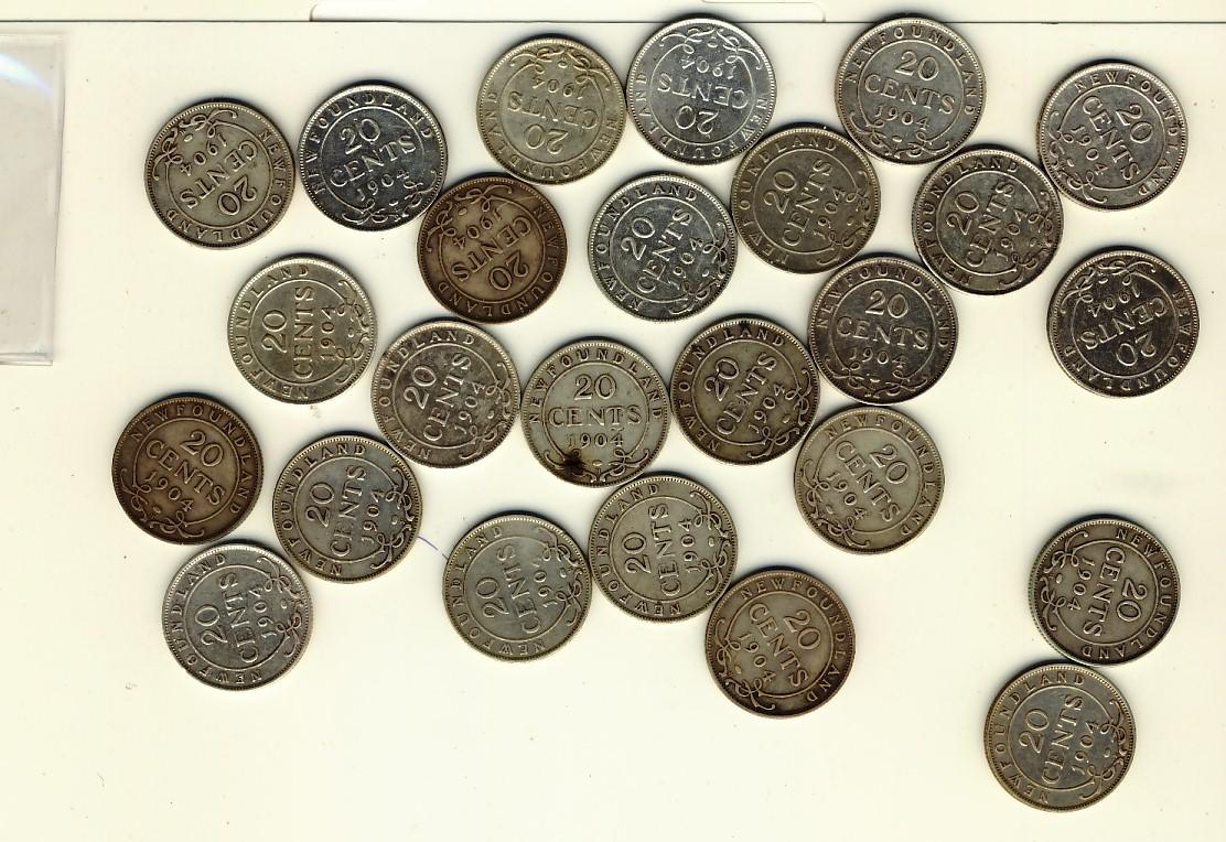 Nfld 1904H 20¢. Lot of 25 coins Good to VG. Should be viewed.