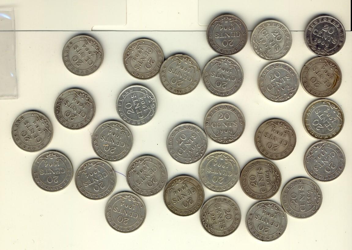 Nfld 1904H 20¢. Lot of 28 coins Good to VG. Should be viewed.
