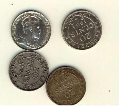 Nfld 1904H 20¢. Lot of 4 coins Good to Fine to VF to EF. Should be viewed.