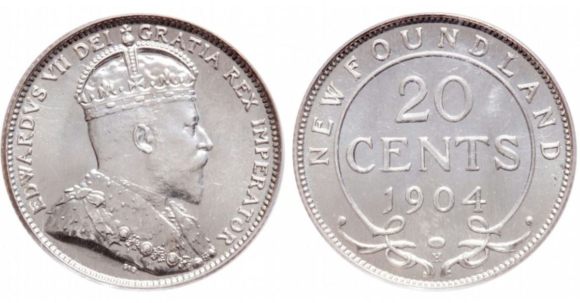 Nfld 1904H 20¢ PCGS SP66. A fully brilliant gem Specimen, with deep mirror fields, a superb strike and great 'eye appeal'.